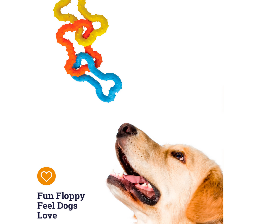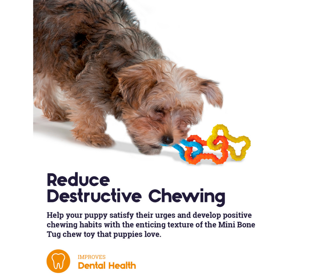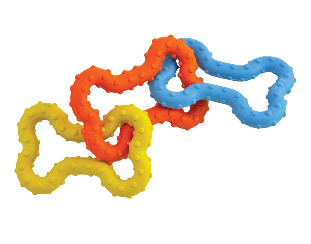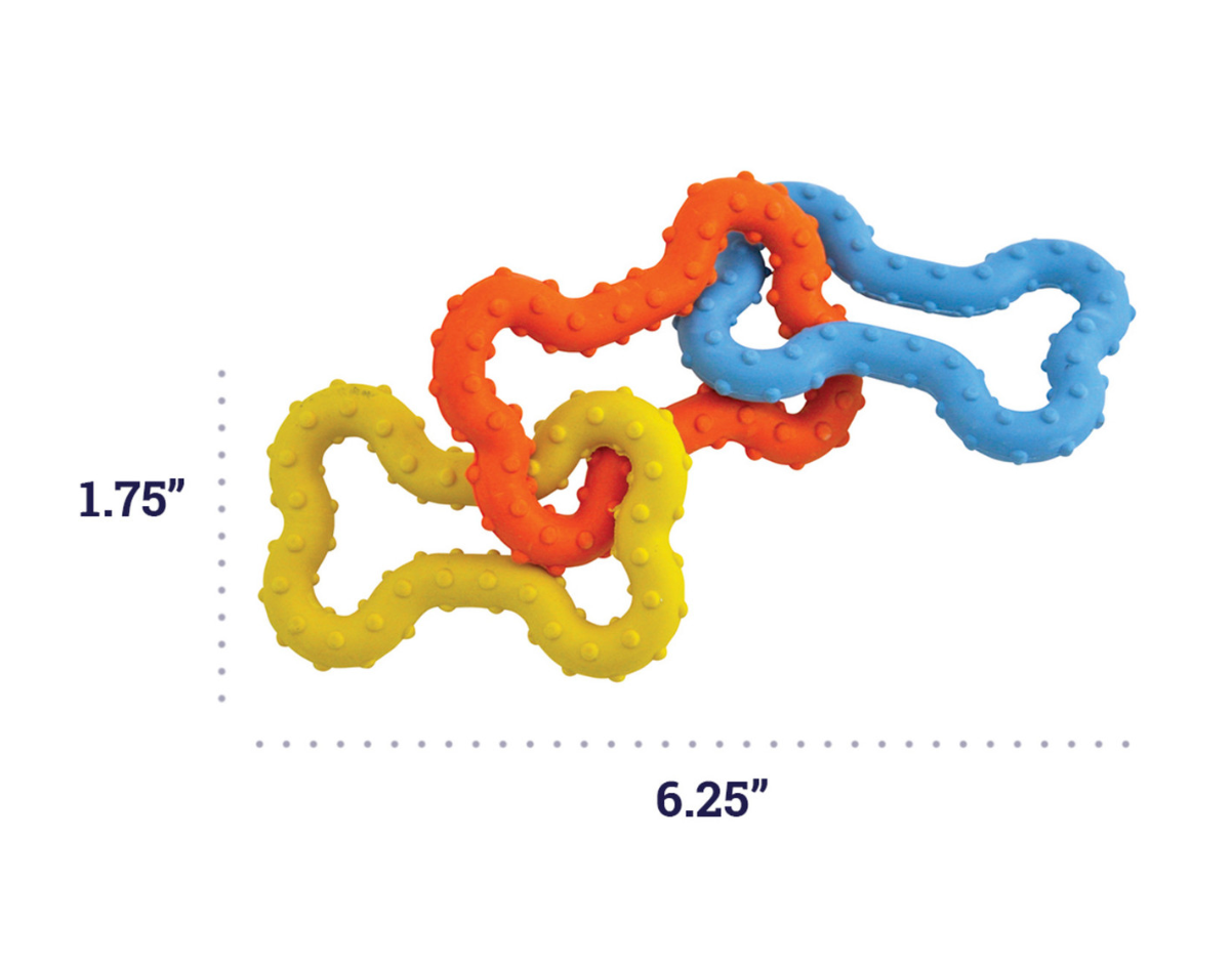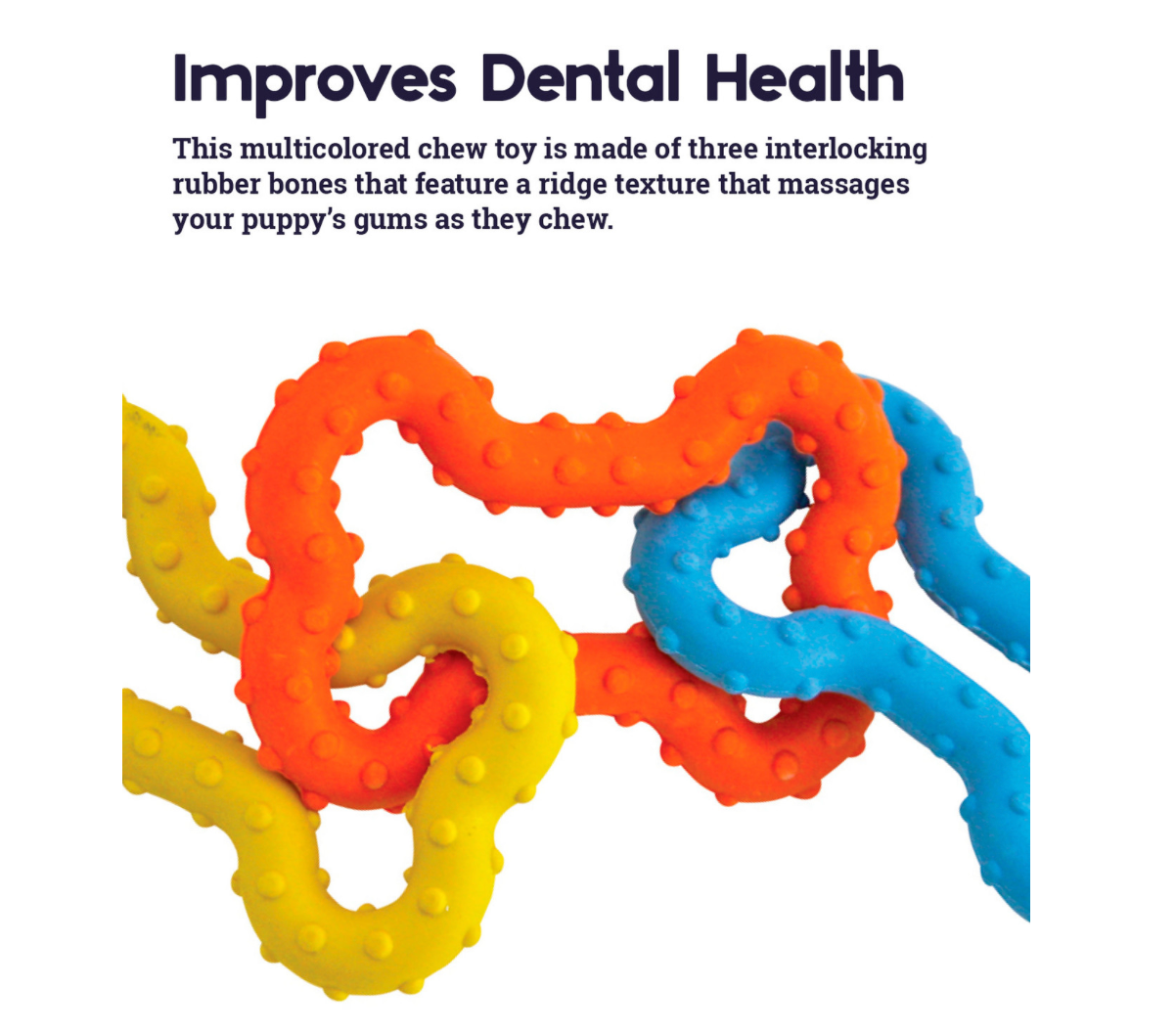 The Petstages Mini Bone Tug Puppy chew toy is a floppy and fun take on a traditional chew toy. This multicolored chew toy is made of three interlocking rubber bones that feature a ridge texture that massages your puppy's gums as they chew. The pliable rubber material makes this chew toy great for games of tug-of-war as well toss and fetch. Cleans easily with warm soap and water.Made in United StatesThe Petstages Mini Bone Tug Puppy chew toy is a floppy and fun take on a traditional chew toy. This multicolored chew toy is made of three interlocking rubber bones that feature a ridge texture that massages your puppy's gums as they chew. The pliable rubber material makes this chew toy great for games of tug-of-war as well toss and fetch. Cleans easily with warm soap and water.Made in United States