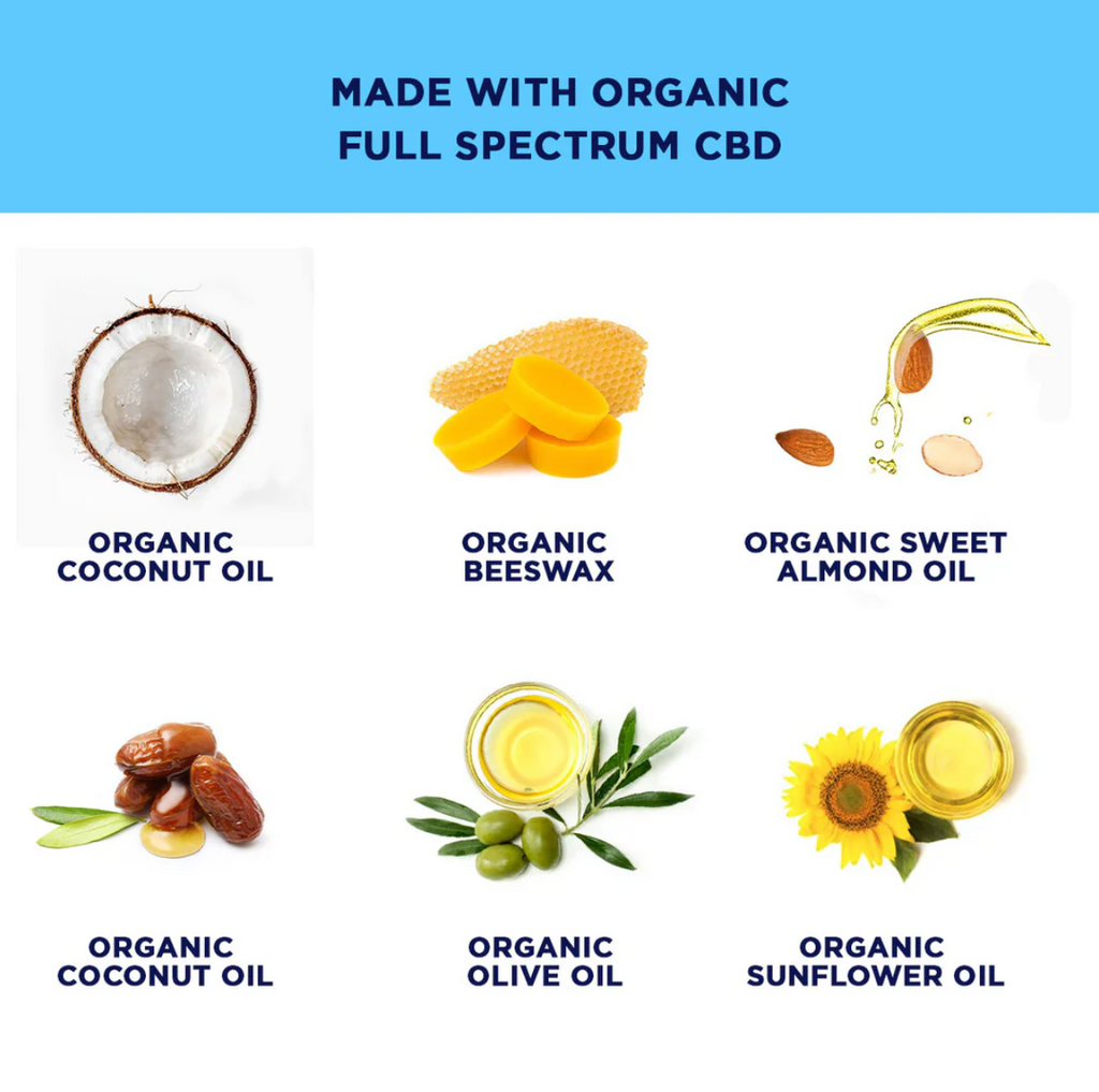 Organic Coconut Oil, Organic Beeswax, Organic Sweet Almond Oil, Organic Jojoba Oil, Organic Olive Oil, Organic Sunflower Oil, Organic Calendula Infused Oil, Organic Plantain Infused Oil, Organic Comfrey Infused Oil, Organic Carrot Seed Oil, Organic Full Spectrum CBD, Organic Rosemary Antioxidant.