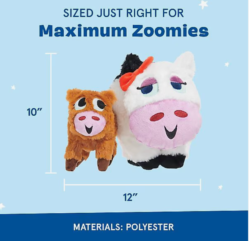 Bring your pup’s playtime to the farm with BARK Bertha the Cow Plush Dog Toy, the hilarious 2-in-1 plush dog toy from BARK that will bring endless joy to your pup's playtime! This extra large birthing cow comes with a surprise inside - a baby calf plush tucked inside her belly. With two built-in squeakers (one in each toy), packed fluff, and crazy crinkle, Bertha offers a sensory-rich experience for your furry friend. She's perfect for medium to large dogs and can even be used as an enrichment toy when filled with treats. From the creators of BarkBox, Bertha is play-tested, dog-approved, and backed by BARK's Happiness Guarantee. Get ready for some "moo moo ga ga" fun with your pup and Bertha the Cow. Please supervise play and remove the toy if damaged. Not intended for children.