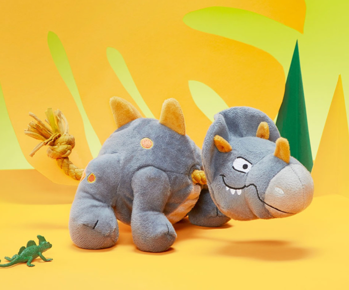 Wrestle and tug into the past with the fun BARK Plush Rope Dog Toy Herbert the Herbivore! This triceratops dog toy is your pup’s new favorite prehistoric plaything. Herbert the Herbivore might look peaceful, but this vegetarian’s ready to rumble. Made with a pull-through T-shirt rope that’s great for tug-o-war, and just when you think he’s going extinct, Herbie reveals a spiky, squeaker ball bonus toy hidden inside his chewrassic body!