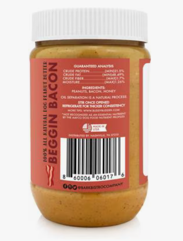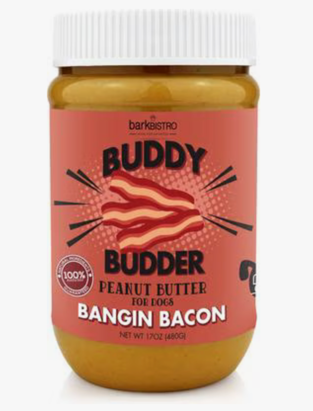 Watch your furry buddy’s tail wag while he enjoys Bark Bistro Company Banging Bacon Buddy Budder! This lickable dog treat is all-natural peanut butter that’s completely free from those icky ingredients, like stabilizers, hydrogenated oil, artificial sugars, salt and xylitol. Feed it to your dog with a spoon, from the jar, inside an enrichment toy, or put it in a silicone mold and freeze it to create scrumptious frozen treats. You can also bake with it or refrigerate it and use it as a pill pocket to hide his medicine! There are countless ways for your canine companion to enjoy this whisker-licking Buddy Budder!