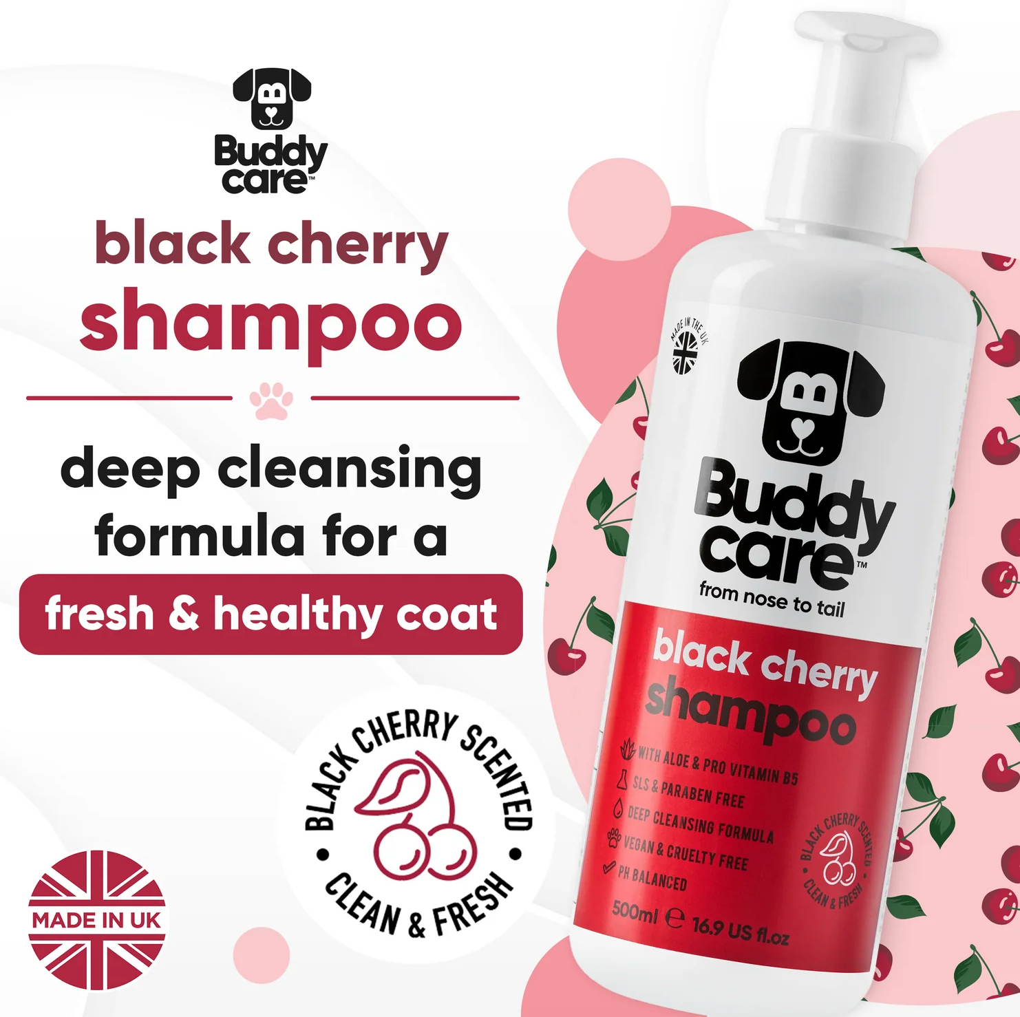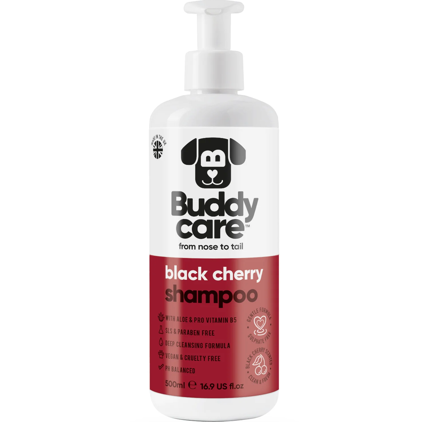 • Black Cherry Scented • With Aloe & Pro Vitamin B5 • SLS, SLES, Sulphate & Paraben Free • Deep Cleansing Formula • Vegan & Cruelty Free • PH Balanced