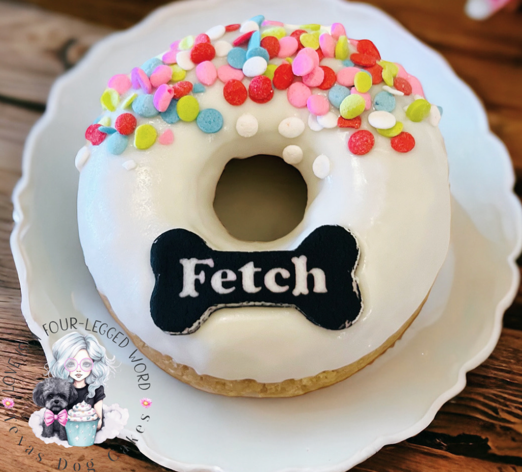 These doggie donuts look delightful and is sure to be a hit with the canine crowd! It’s a delectable puffed rice treat, shaped like a classic donut, with a substantial mix of peanut butter and honey that serves as the scrumptious base. The donut is coated in a smooth, creamy yogurt frosting that’s dog-friendly and gives it a glossy finish. Adorning the top are colorful, confetti-like sprinkles that add a fun pop of color. The centerpiece of the decoration is a black bone-shaped accent with the word “Fetch” written in a playful, white font. It’s a charming and delicious treat for any dog to enjoy!