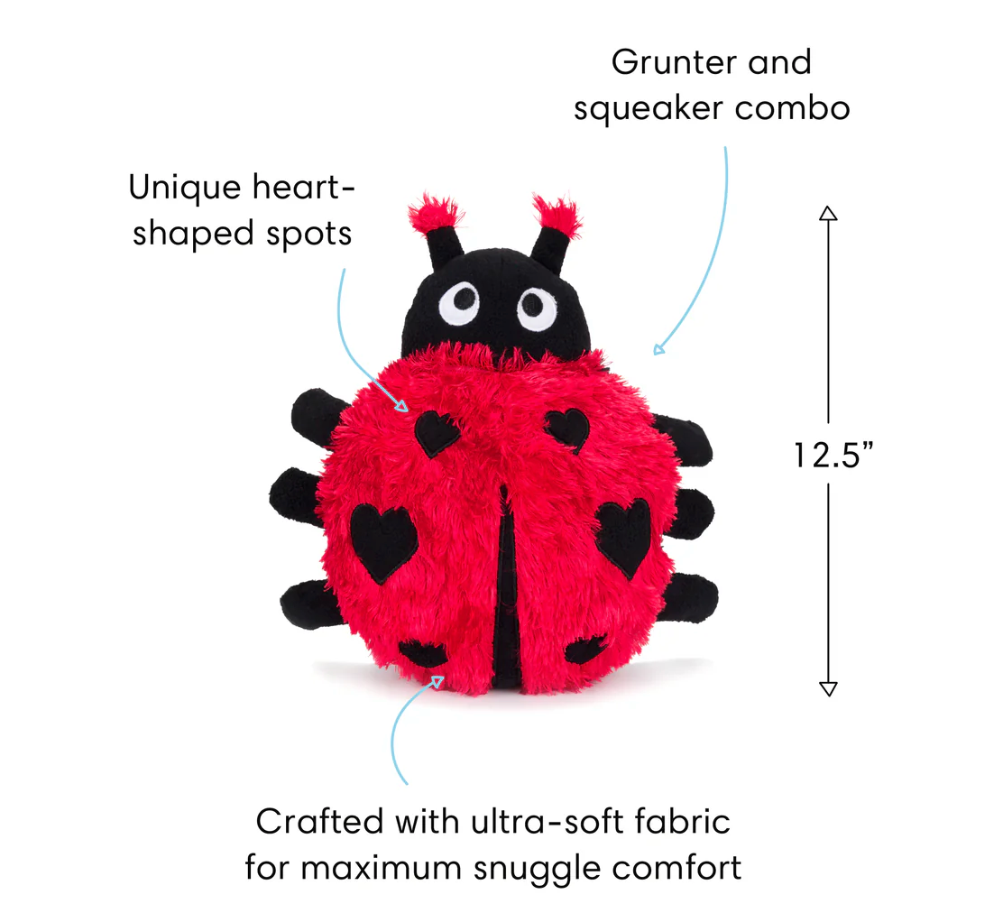 Spotted and sweet with hearts on her back, this lovebug is ready to snuggle! With super shaggy fur, a grunter and a squeaker inside, she’s all charm and cheer—perfect for pups who love a little extra fluff with their playtime!