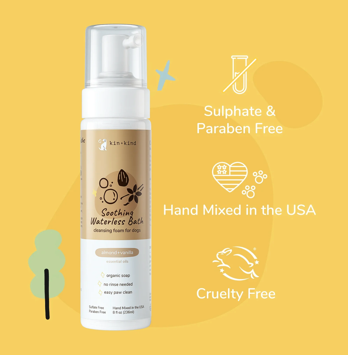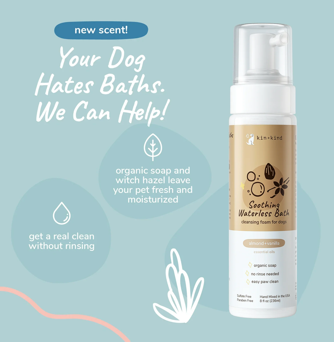 Rinse Free Clean: Your pet hates baths, so get the clean and skip the fuss. Cleanse your pet's skin, coat, and paws between baths and after walks. Our rinse free foam is made from natural soap for a real clean.