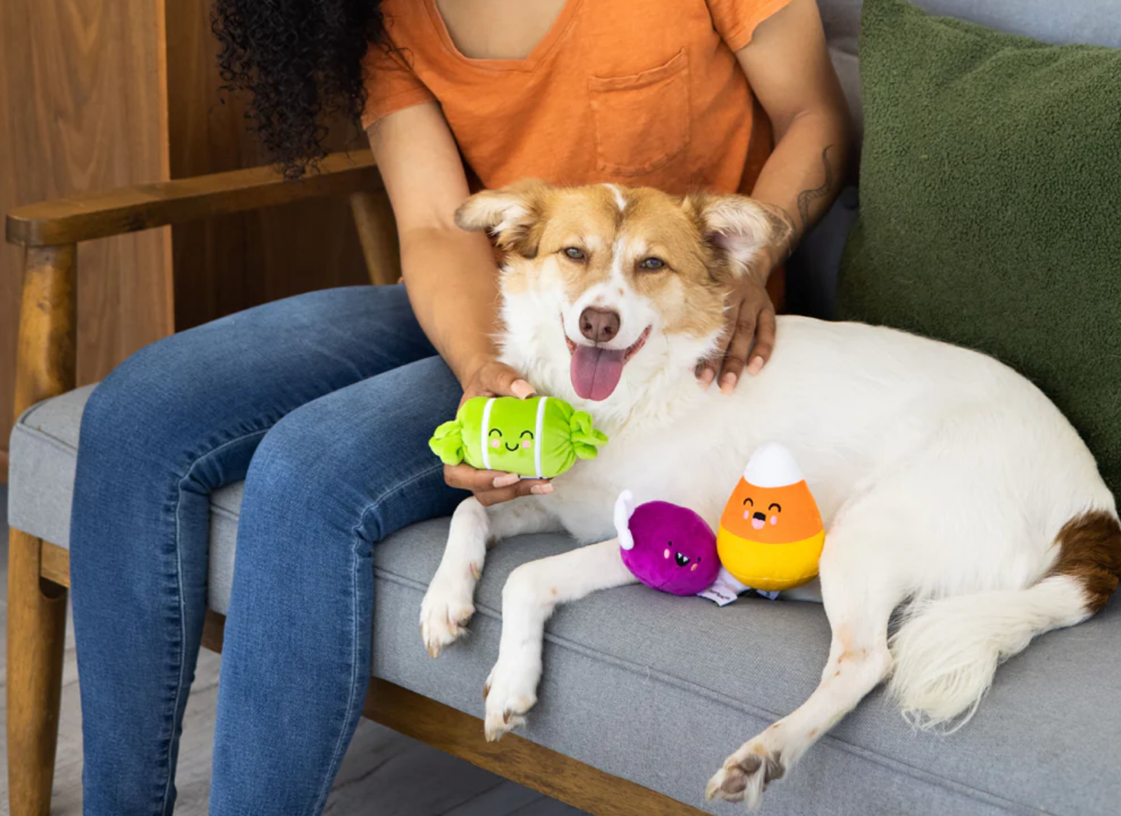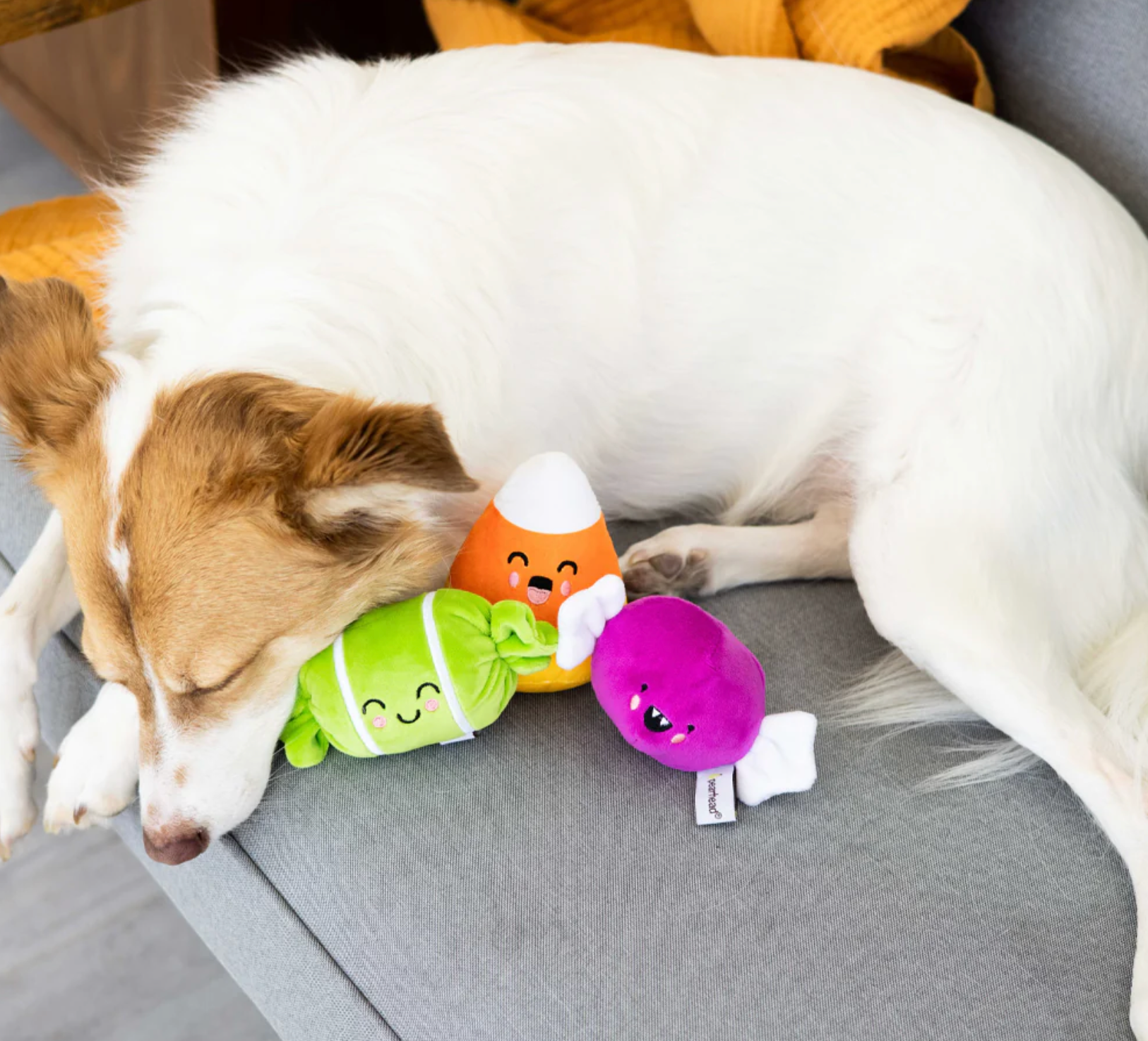 • Show your dog some extra love on Halloween with these adorable plush squeaker Halloween candy toys by Pearhead!