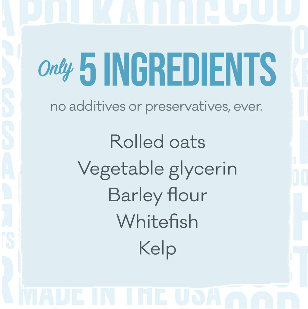Rolled Oats, Vegetable Glycerin, Barley Flour, Whitefish, Kelp