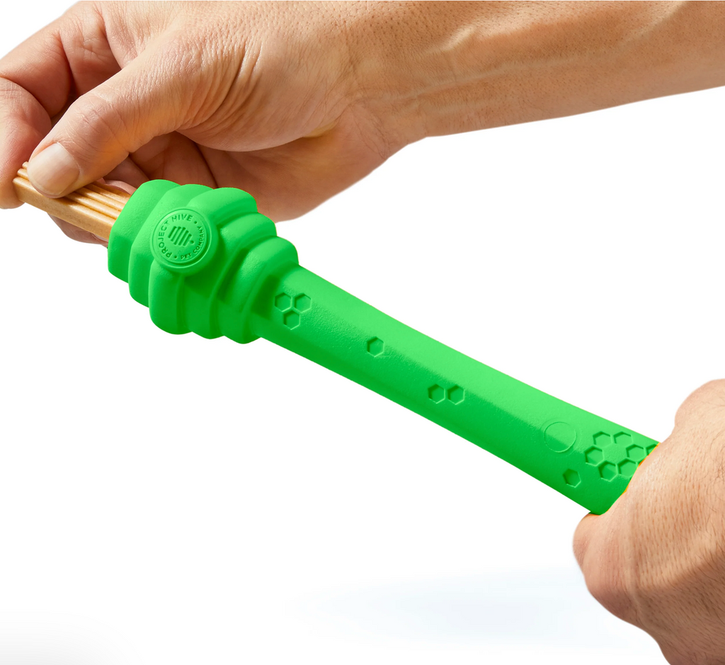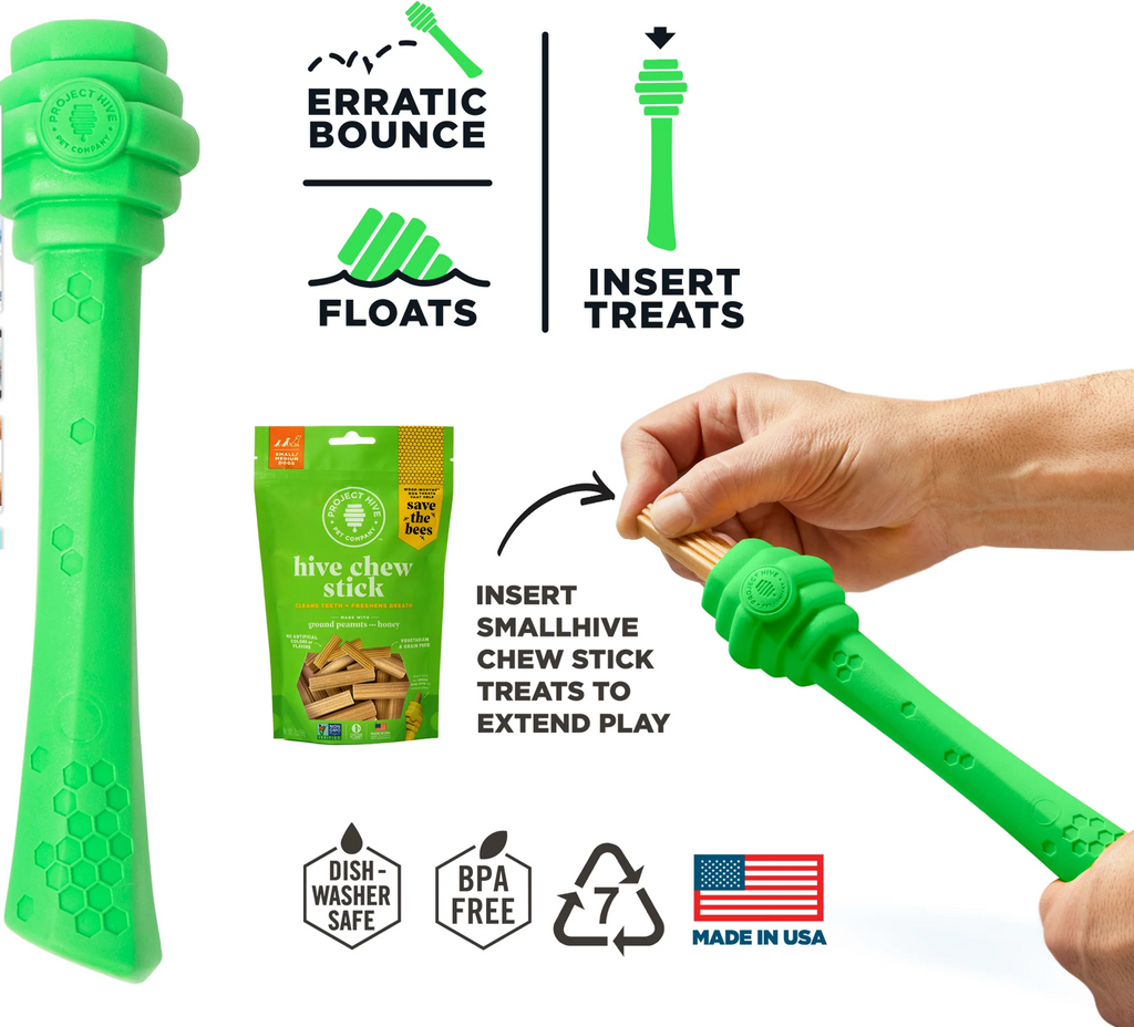 Interactive Tip: Insert Small Hive Chew Stick Treats into the cavity end of the Fetch Stick for extended play.