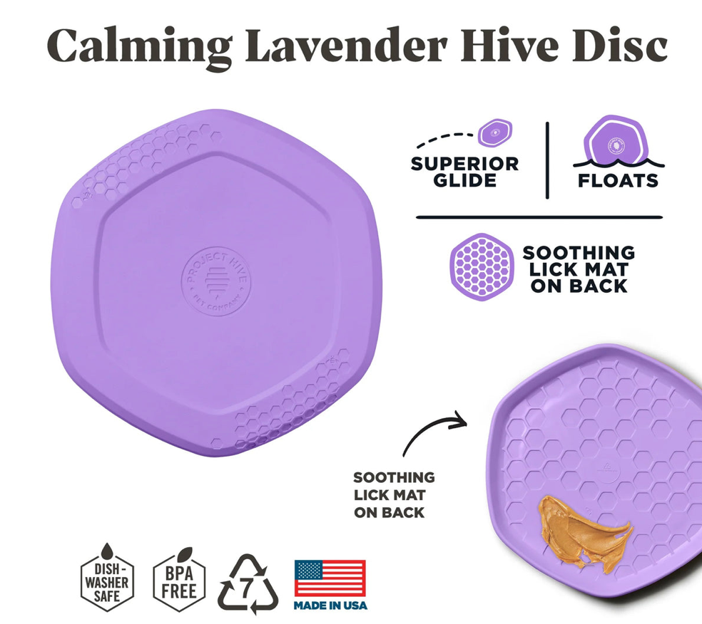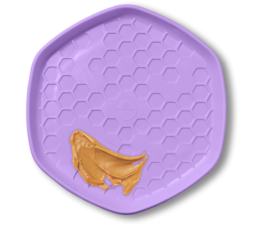 Flip it over! The back of the Hive Disc is a soothing lick mat. Apply a spreadable treat (like peanut butter, cheese, or yogurt) to the textured honeycomb pattern to help relieve anxiety and calm your dog.