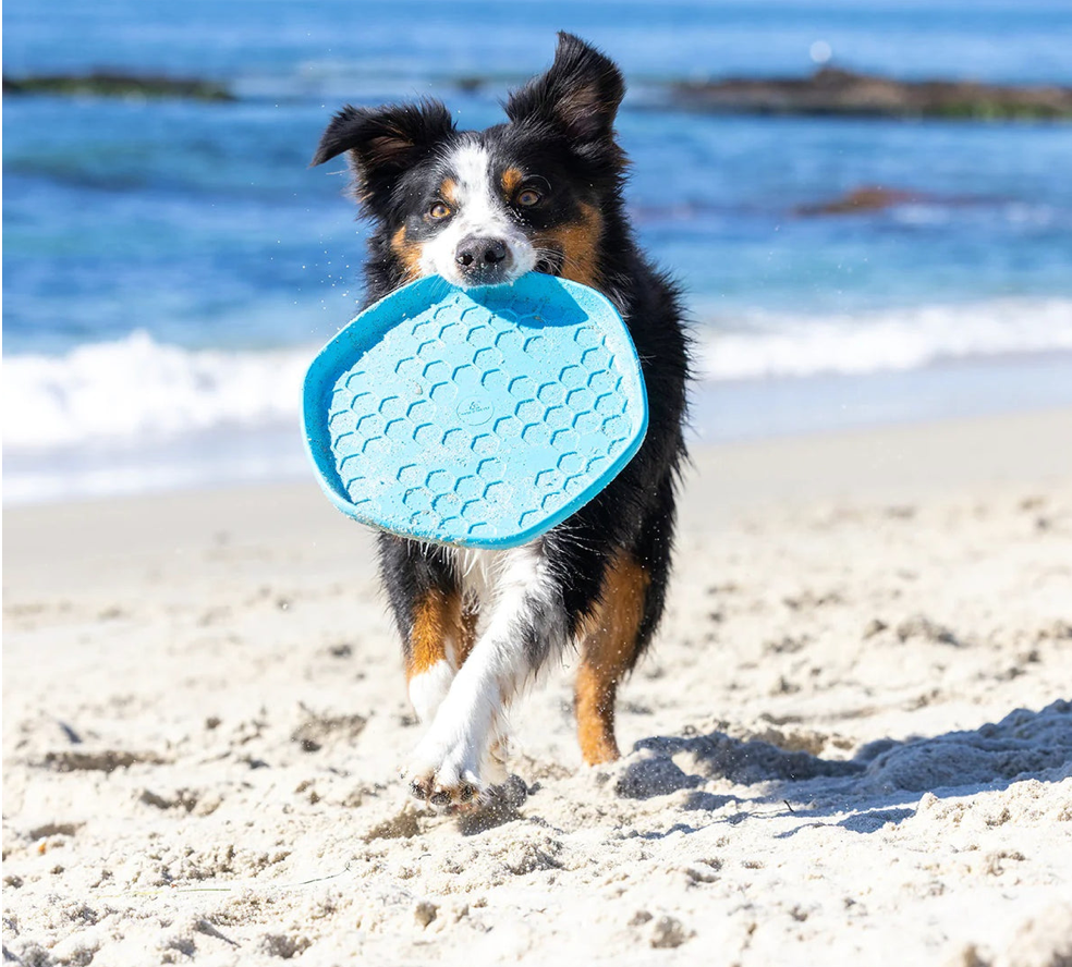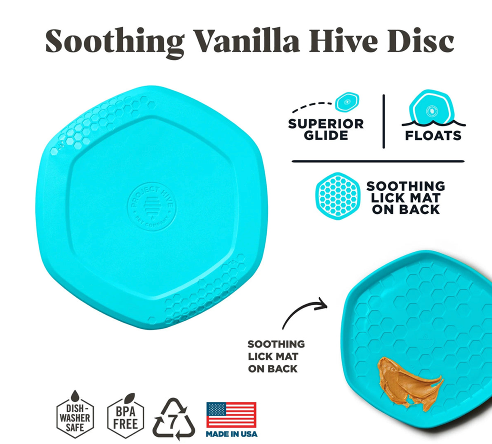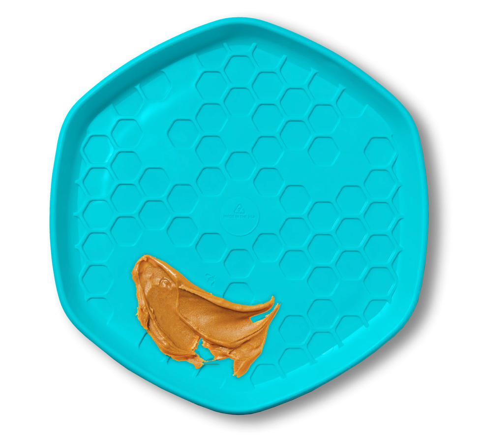 Flip it over! The back of the Hive Disc is a soothing lick mat. Apply a spreadable treat (like peanut butter, cheese, or yogurt) to the textured honeycomb pattern to help relieve anxiety and calm your dog.