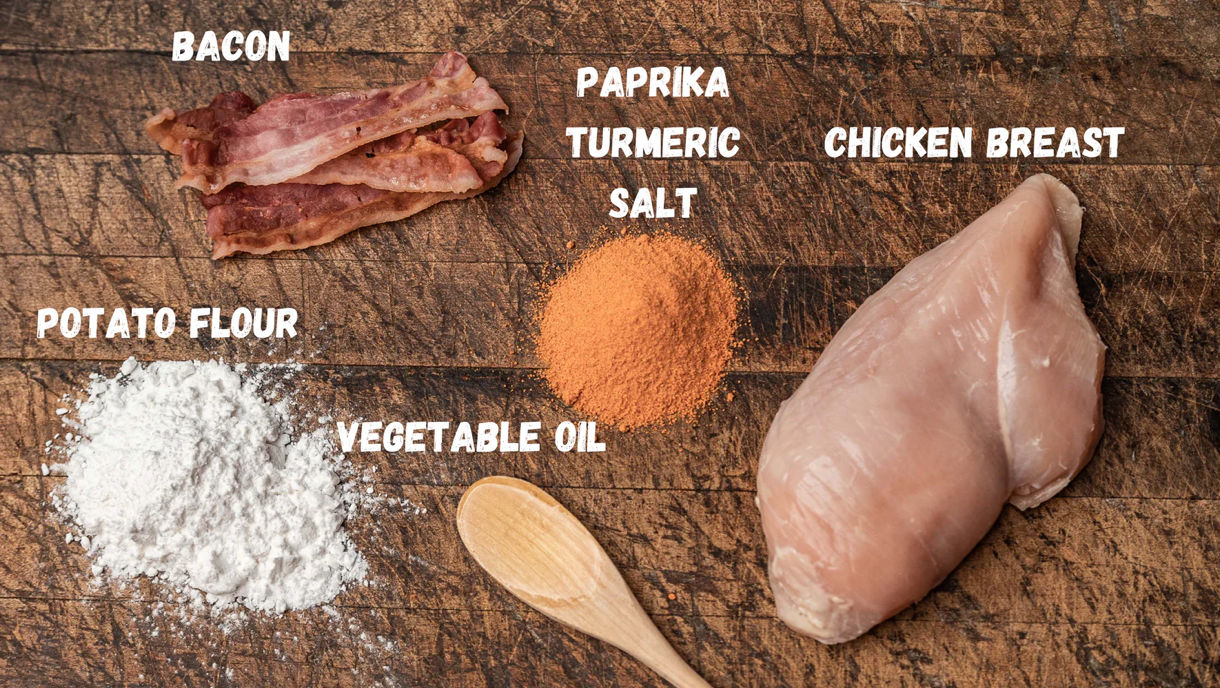 Chicken, Bacon, Potato Flour, Vegetable Oil, Paprika, Turmeric, & Salt.