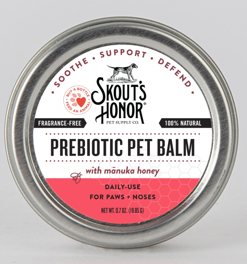 Skout’s Honor Prebiotic Pet Balm is a 100% natural, Microbiome-Friendly Certified solution for dry paws, noses, skin folds, and other sensitive areas. Made with a prebiotic and mānuka honey, this daily essential soothes, supports, and defends against common environmentally-caused skin issues such as dryness, itch, odor, or irritation. Target specific problem areas or use as part of your regular grooming routine to keep skin hydrated, balanced, and feeling good. As part of the Skout’s Honor Wellness collection, our Prebiotic Pet Balm is backed by science and powered by nature to offer a modern, holistic approach that targets the root cause of pet skin problems.