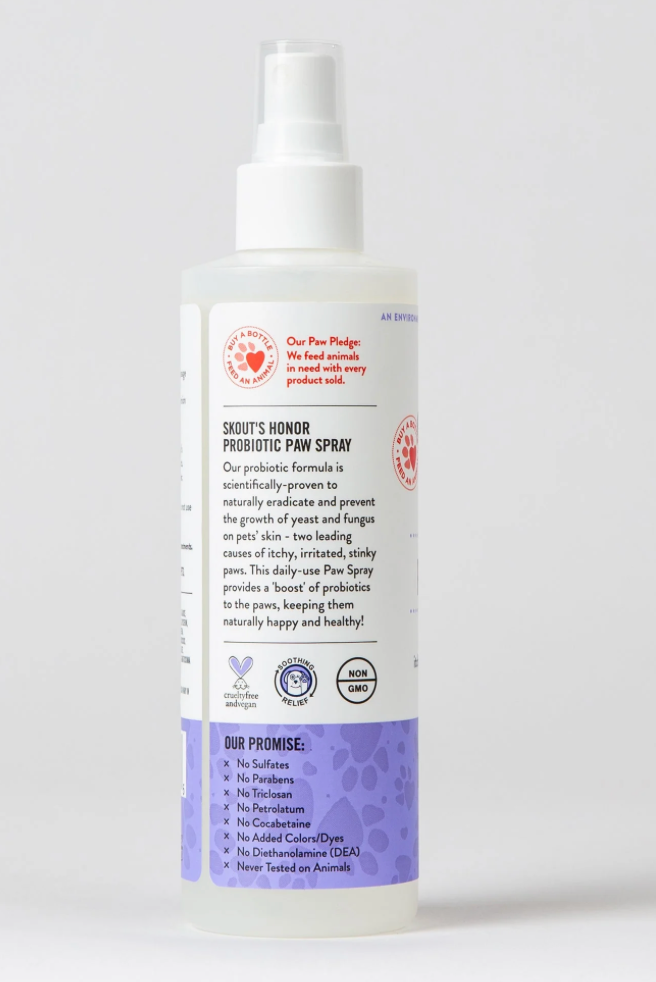 Our Probiotic Paw Spray supports healthy skin and relieves itchy, stinky and irritated paws. It is also non-medicated, alcohol-free and hypoallergenic for those pets with sensitive skin.