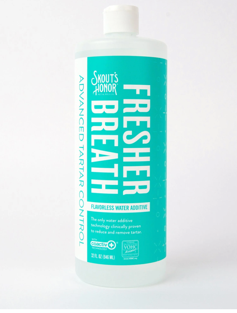 Great for... Pet parents who are looking for an easy solution to reduce their pets bad breath, plaque and tarter. This pet-safe solution makes it easy to create a better oral care routine for your pet - no brushing required!  Instructions: Add two big squeezes of Water Additive to each new bowl of water to freshen breath fast, fight plaque and tartar, and live your best life together. Skout’s Honor’s Water Additive is proven to freshen breath fast, while helping to reduce plaque and tartar at the source. This pet-safe solution makes it easy to create a better oral care routine for your pet - no brushing required! Simply add to their water bowl daily and experience noticeably fresher breath and cleaner teeth. Fresh & Flavorless Formula