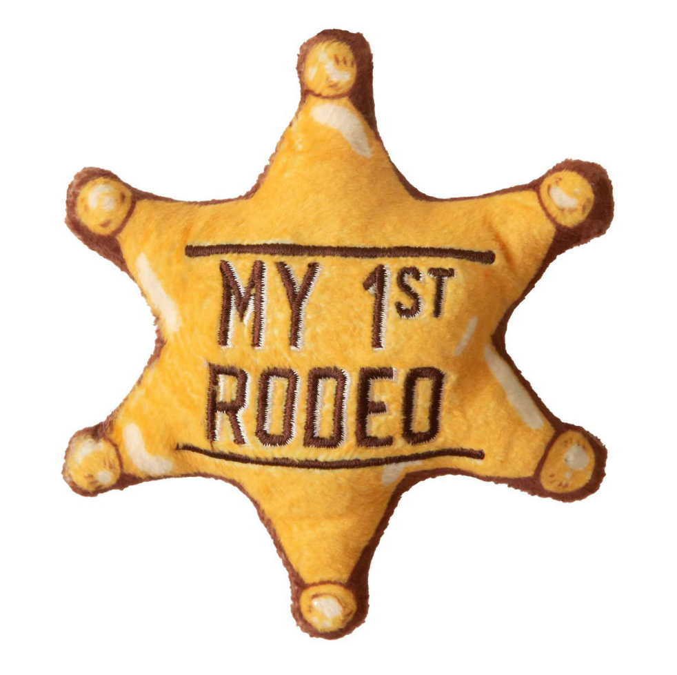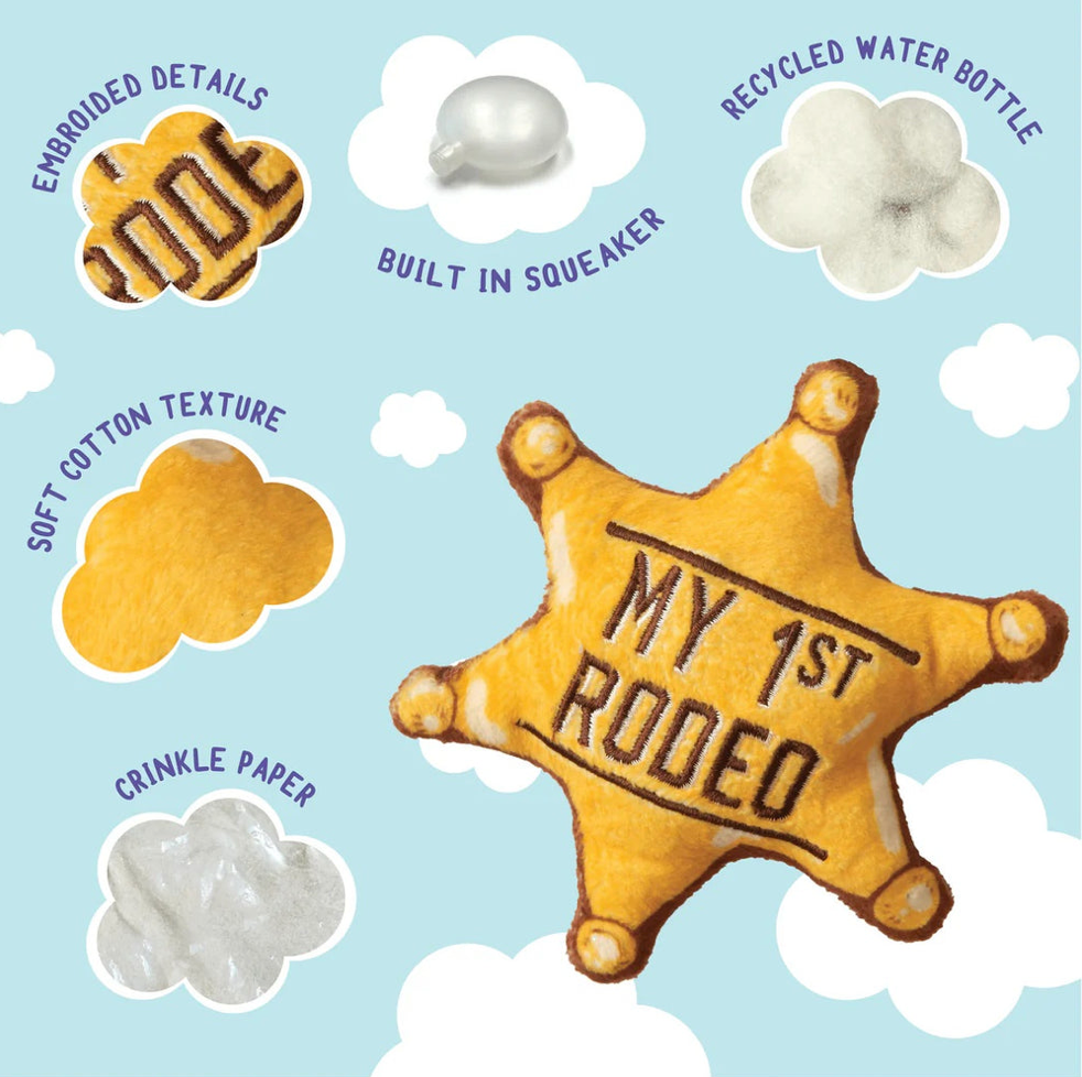 Yeehaw! It’s My 1st Rodeo – A Toy for the Littlest Cowboys and Cowgirls! Giddy up, little partner! The Snugarooz "Baby 1st Rodeo" plush toy is the perfect way to kickstart your pup’s wild west adventures. Shaped like a classic sheriff’s badge and embroidered with “My 1st Rodeo,” this toy is ready to wrangle some serious fun. Whether your pup is a tiny tot or just young at heart, this squeaky badge is made for playful rodeos right at home.