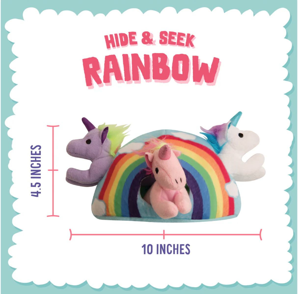 Delight your curious pup with this Hide & Seek Rainbow. Perfect for dogs who need mental stimulation, this interactive toy is actually four toys in one: a plush rainbow and three squeaky unicorns. Each unicorn fits inside of the rainbow for your dog to discover and remove. Once your pup has completed their adorable mission, put the unicorns back inside the rainbow or play with each toy individually.