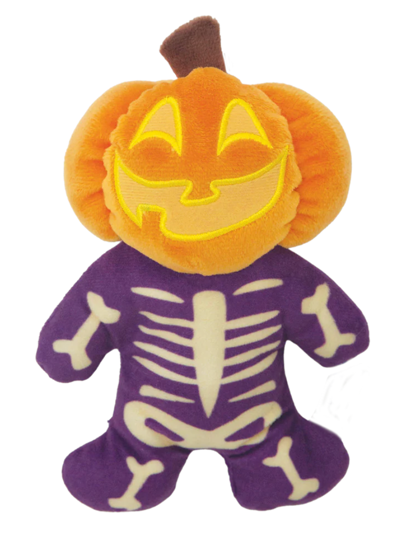 Introducing Jack the Skeleton! Don’t let his pumpkin head scare you. He just wants to be loved! Toy contains crinkle & squeaker. This toy is made from recycled water bottles.