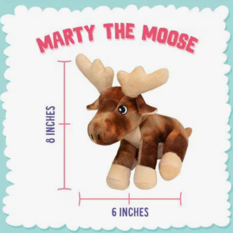 Meet Snugarooz Marty the Moose Squeaky Dog Plush Toy. This adorable woodland friend is the perfect companion for your furry pal. Made with soft and durable material, Marty is designed to withstand endless hours of playtime. With embroidered eyes, velvety antlers, and a mix of squeaky and crinkly filling, this toy is sure to keep your tail wagging BFF entertained. Measuring eight inches tall and six inches long, Marty is the ideal size for smaller to medium-sized pups.