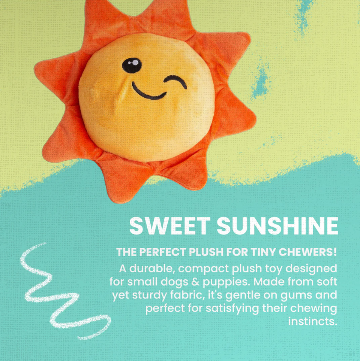 Treat your pup to the perfect companion for a sunny day - Sweet Sunshine (2 in 1 Toy)! This adorable plush yellow squeeker toy features an irresistible winking eye surrounded by fun orange flames and will bring all the joy of summer fun wherever it goes. Toy is made from recycled water bottles and contains eco-friendly squeaker and crinkle material for hours of crinkly, squeaky fun! Toy is 5” in size.