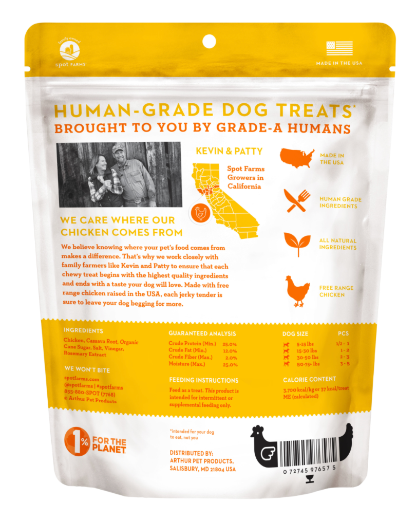 Spot Farms Basics Jerky Tenders have everything your dog needs and nothing they don’t. We start each recipe with premium, 100% human grade meat sourced from USA farmers and cooked in small batch USDA kitchens. No glycerin, no grains, and no antibiotics ever in these chewy jerky treats your dog will love.
