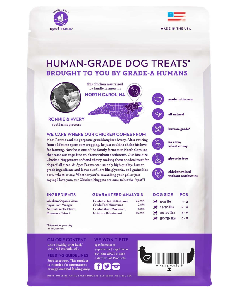 Our bite-size Chicken Nuggets are soft and chewy, making them an ideal treat for dogs of all sizes! Here at Spot Farms we use only high quality, human grade ingredients, and leave out fillers like glycerin, which can give your dog a tummy ache, and grains like corn, wheat and soy. Whether you’re rewarding your pal or just saying I love you, our Chicken Nuggets are sure to hit the “spot”!
