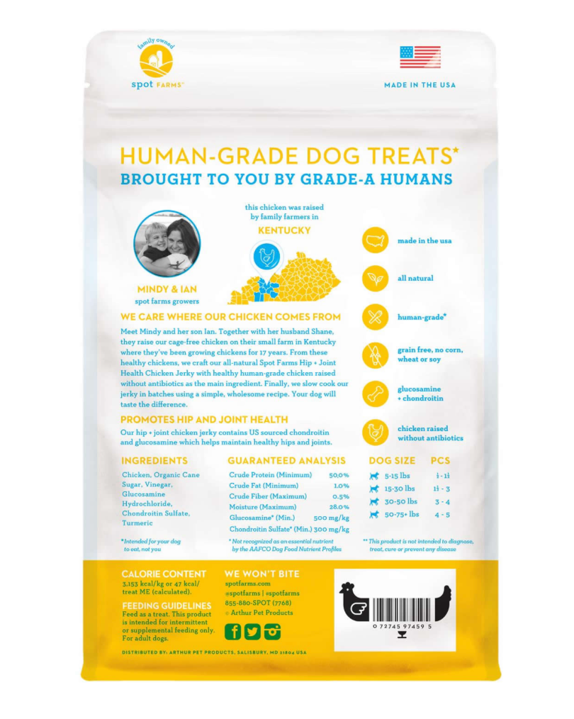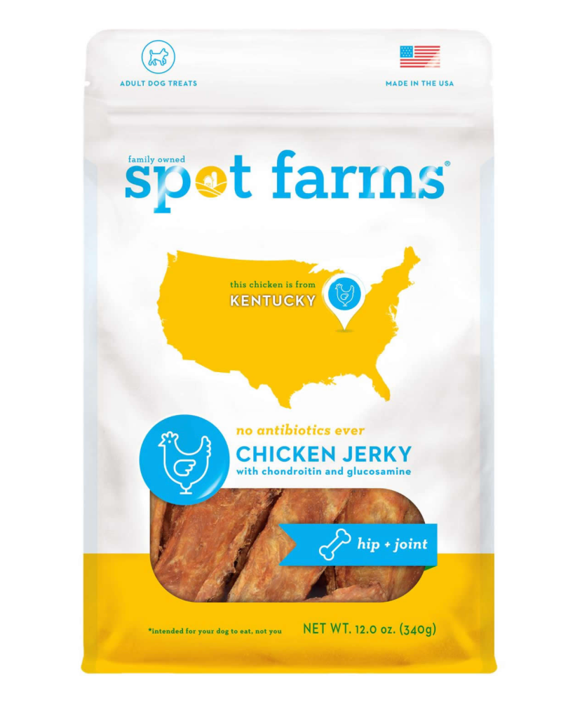 Spot Farms’ functional line of all-natural chicken jerkies helps to promote your dog’s health and happiness, all while maintaining the delicious flavor your dog loves. Our Hip+Joint Chicken Jerky contains US sourced chondroitin and glucosamine to help maintain healthy hips and joints. This is a treat that will keep your pup moving!