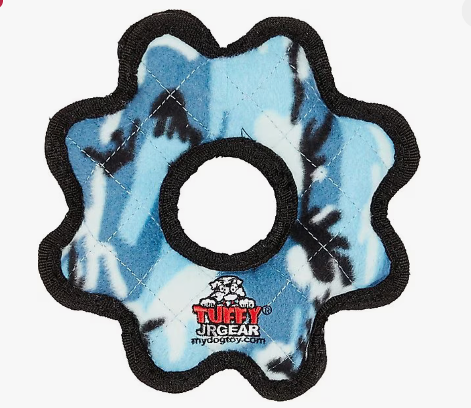 Tuffy's Junior Gear Ring Dog Toy is ideal for interactive play with one or multiple dogs. It’s made with three layers of safe, non-toxic fibers: soft fleece, industrial grade luggage material, and plastic coating. All three are fused and sewn together to make one ultra "tuff" layer, ensuring this toy is just as durable as it is fun. It also has a protective pouch around each of its squeakers as an added safety measure in the event your dog gets to the core. This toy is great for indoor use because of its soft exterior, perfect for outdoor use because it floats in water, and easy to clean because it’s machine washable.