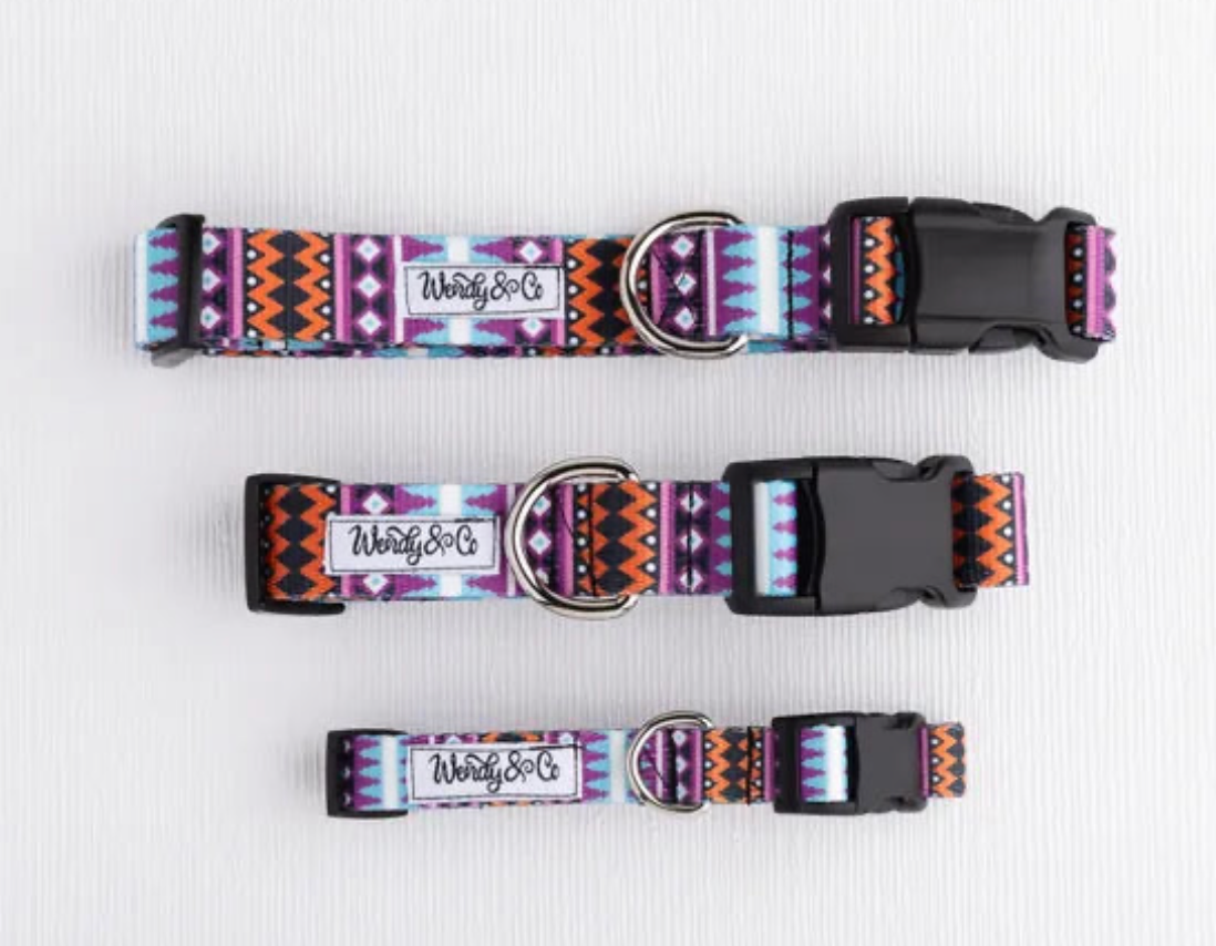 Bold and adventurous—the Amethyst Horizon dog collar is designed for pups with a free spirit. This striking geometric tribal print in shades of deep purples, vibrant oranges, rich blues, and black, remind us of a breathtaking sunset over rugged landscapes.