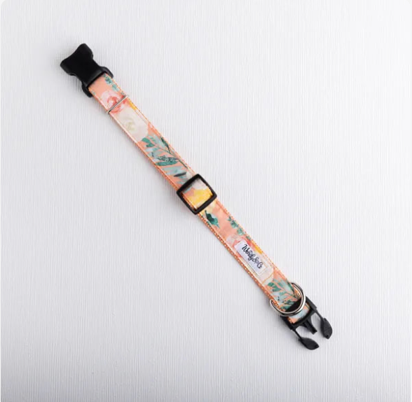 Dress your pup in timeless elegance with our Cottage Bloom Dog Collar. Featuring a peach background with oversized roses and garden florals in pink, cream, tan, and yellow, this collar brings a touch of floral charm to your daily walks. Handmade with durable webbing and YKK hardware, it’s as strong as it is stylish. Perfect for dogs who deserve a little cottage garden luxury.