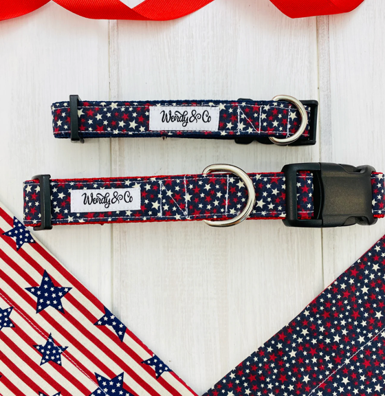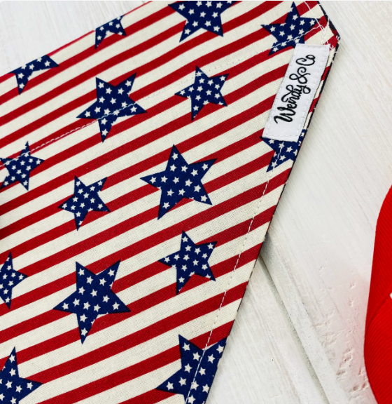 Celebrate with our patriotic dog bandana- red, white and blue festive stars on one side with red and cream stripes and blue stared stars on the other. Perfect for those backyard BBQs, Independence Day parades and all the summer fun!