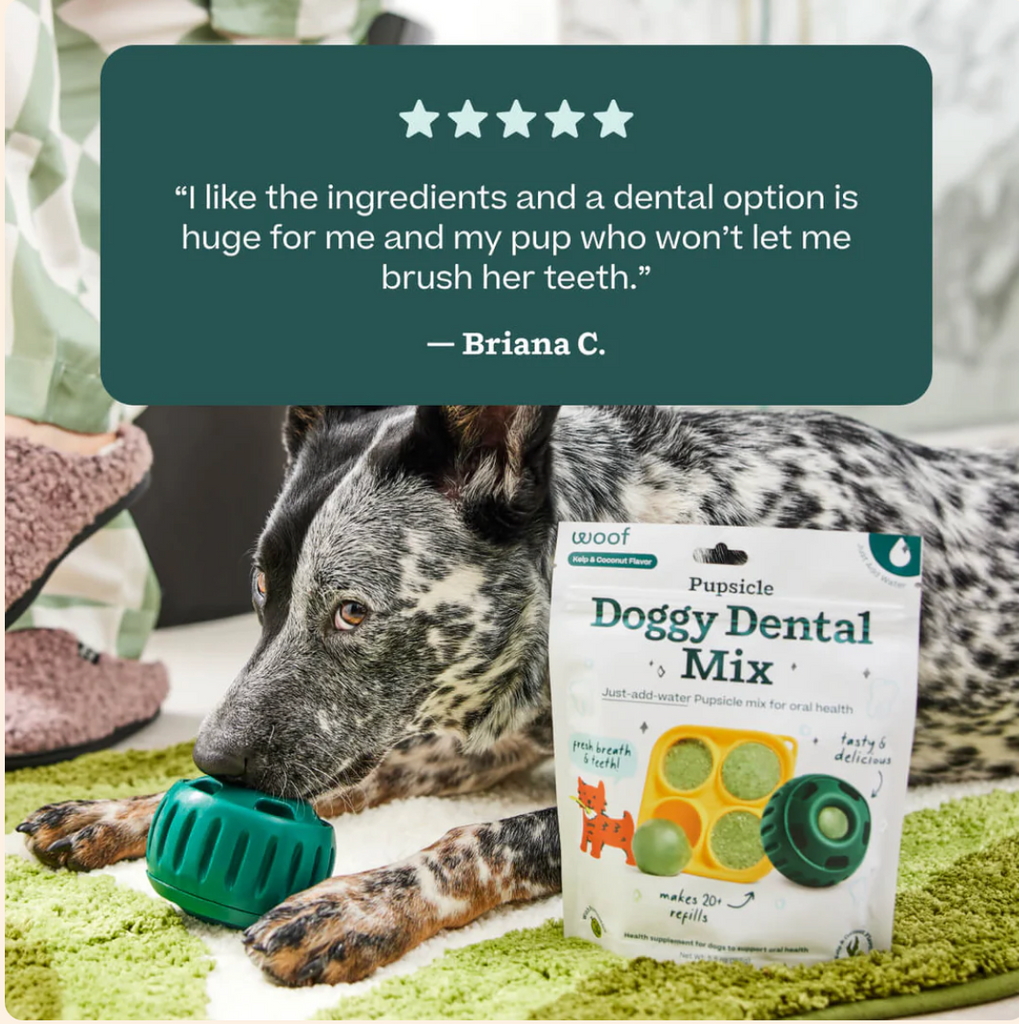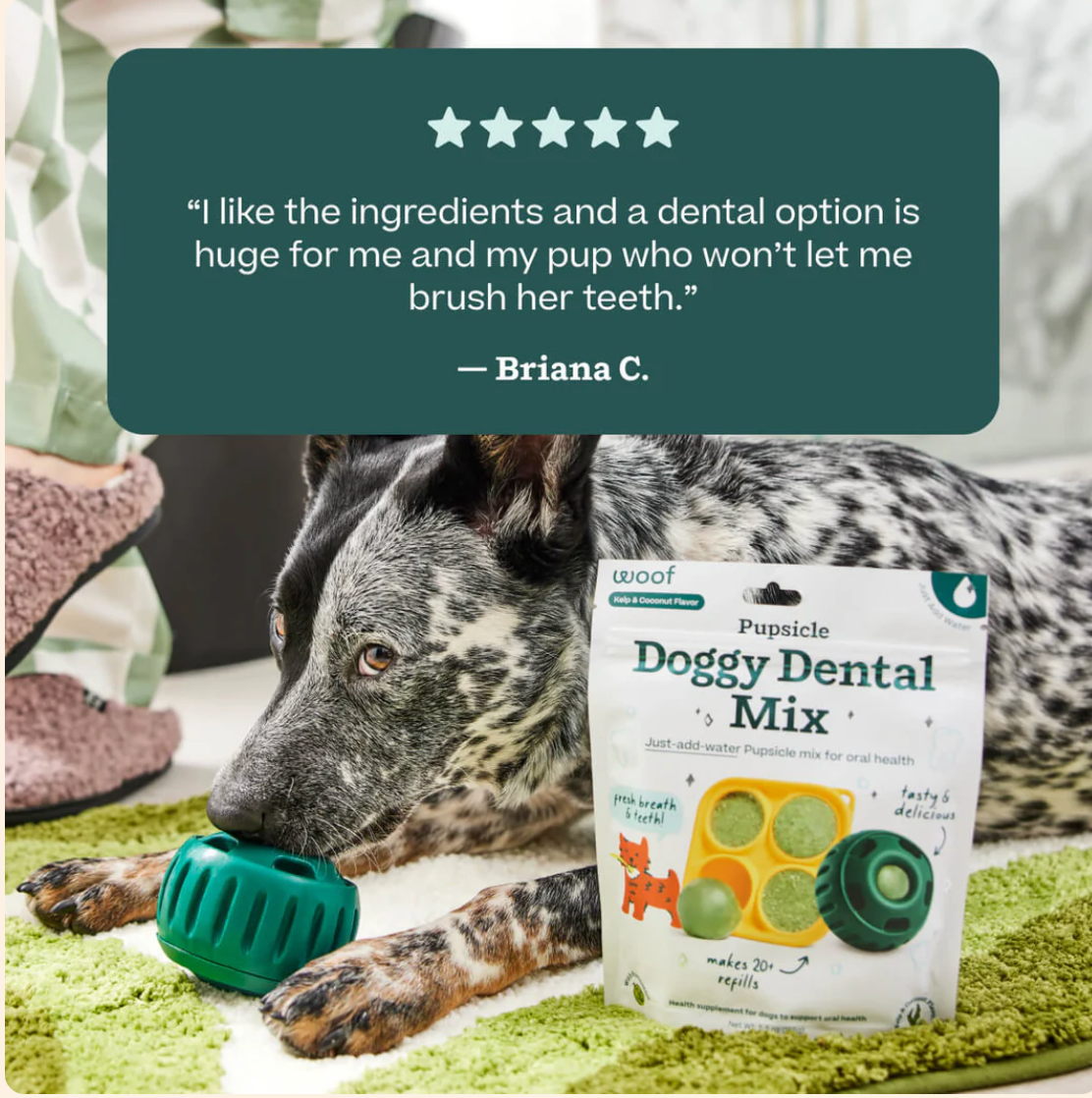 Just mix with water and freeze in the Pupsicle Treat Tray to turn your Pupsicle into a teeth-cleaning powerhouse. Open your Pupsicle, drop in a Doggy Dental pop, and let your pup clean their own teeth!